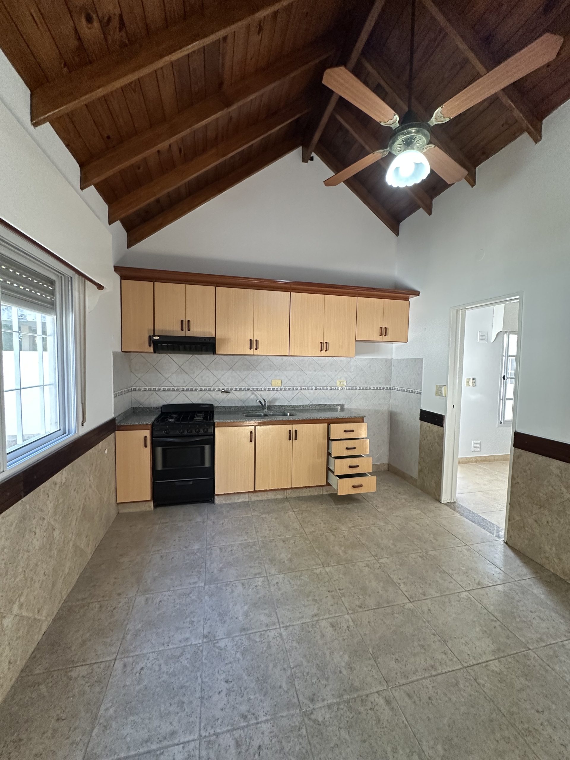 Cocina espaciosa equipada con amoblamientos, extractor y cocina instalada.